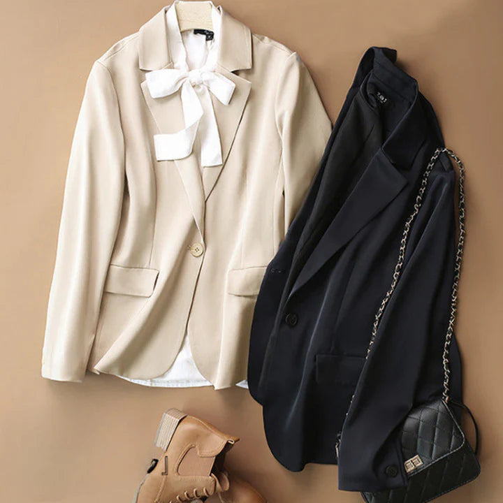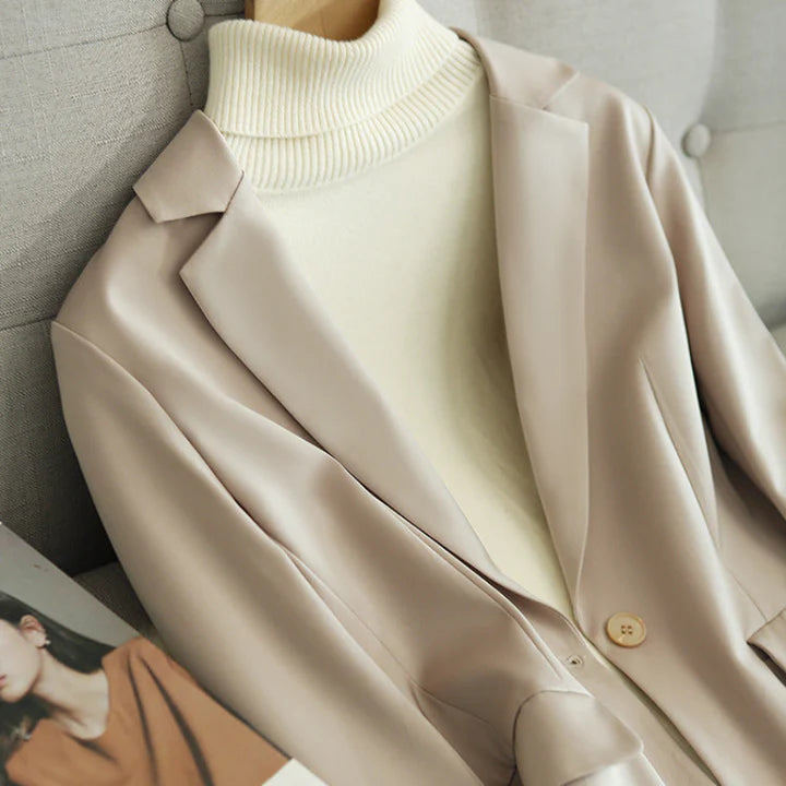 Crafted from premium silk, this blazer breathes quiet charm. Draped in smooth acetate, it moves with hush and grace, framing each step with softened strength. A single button fastens dreams in place—simple, certain, beautifully composed.