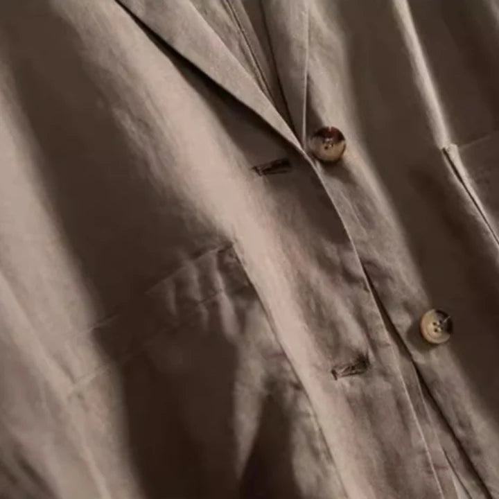 Crafted from breathable Gossamer linen, this blazer lends warmth to soft tailoring. With its rounded hem, deep patch pockets, and relaxed collar, it holds a grounded elegance—made for calm arrivals and steady departures.