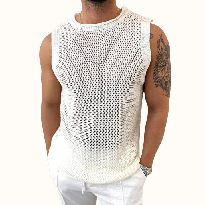 The Lucas Knit Tank is crafted with a slightly open stitch, giving it a hand-crocheted appearance. It offers a dry yet soft feel, and despite its trendy open-knit design, it is not overly sheer—perfect for catching a little extra breeze.