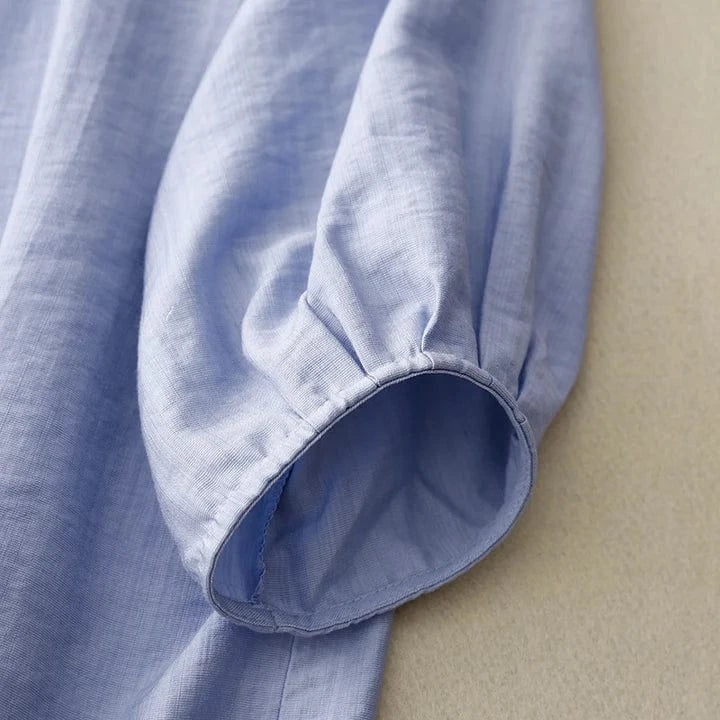 Tailored with a feminine eye and crafted in breathable gossamer linen, this blouse offers the perfect balance of grace and ease. Delicate pleats frame the neckline, while sculpted sleeves and a polished button placket create a silhouette you can wear from desk to dinner—timeless, flattering, and unfailingly polished.
