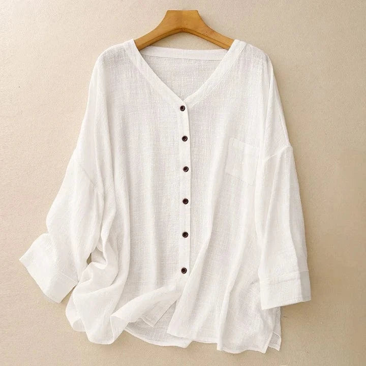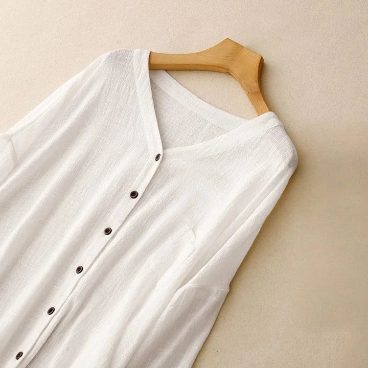Spun from our signature Gossamer linen, this shirt floats between ease and intent. The button front anchors the flow, while a sculpted collarless neckline brings quiet form. Finished with drop shoulders and generous sleeves—meant for light layering and long pauses.