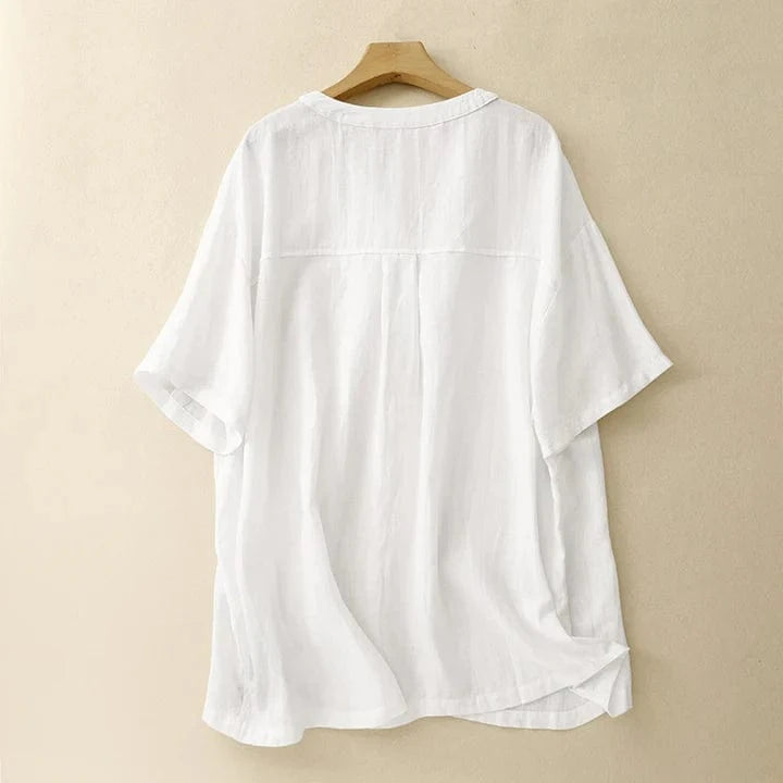 Crafted from pure linen, this blouse floats with a gentle V-neck and airy half sleeves. Subtle gathers and fluid lines move with ease, creating the ultra soft texture this blouse have.
