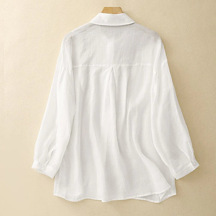 Spun from our exclusive Gossamer linen, this shirt moves with lightness and ease. A classic collar and button-down front keep it crisp, while the airy drape softens every edge—made for sunlit hours and quiet shade.