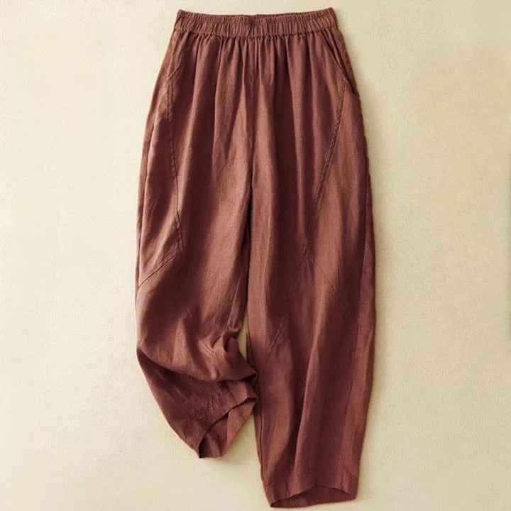 Spun from our breathable Gossamer linen, these softly tapered pants carry quiet structure and gathered ease. An elastic waist rests gently, while curved seams lend gentle rhythm—stitched for days that wander between stillness and stride.