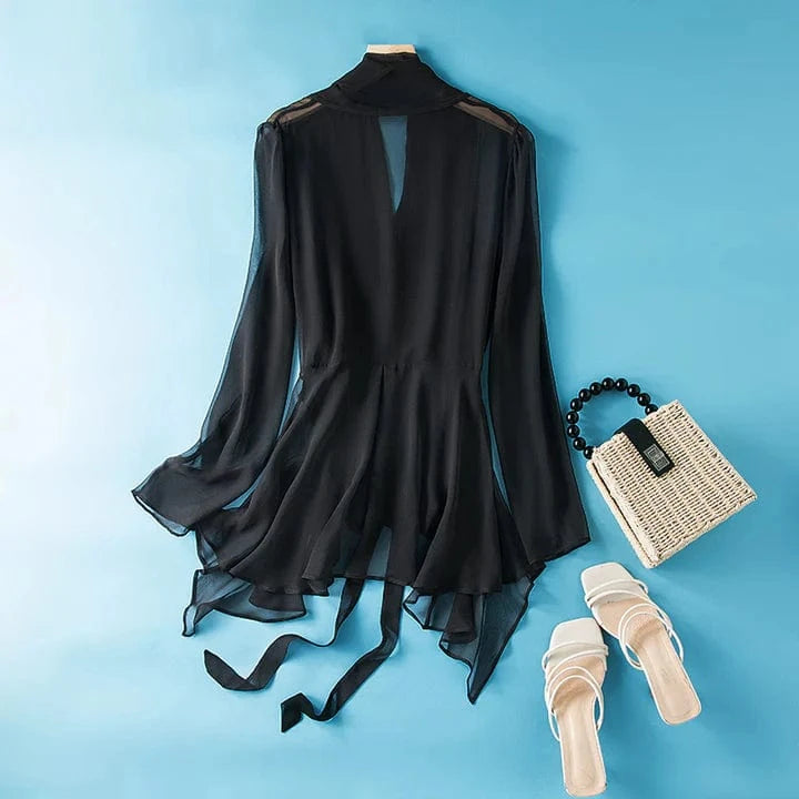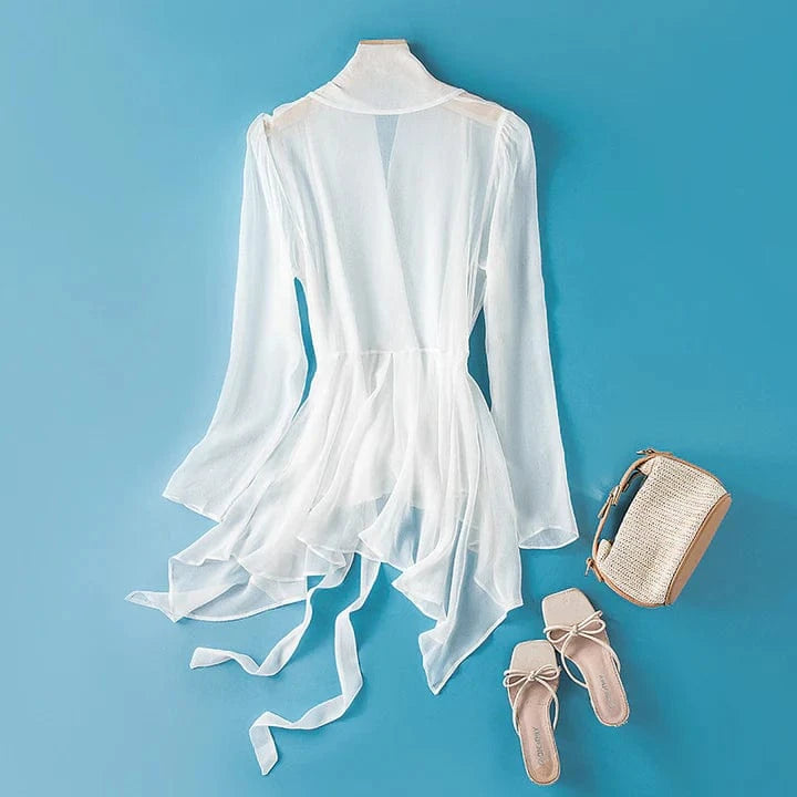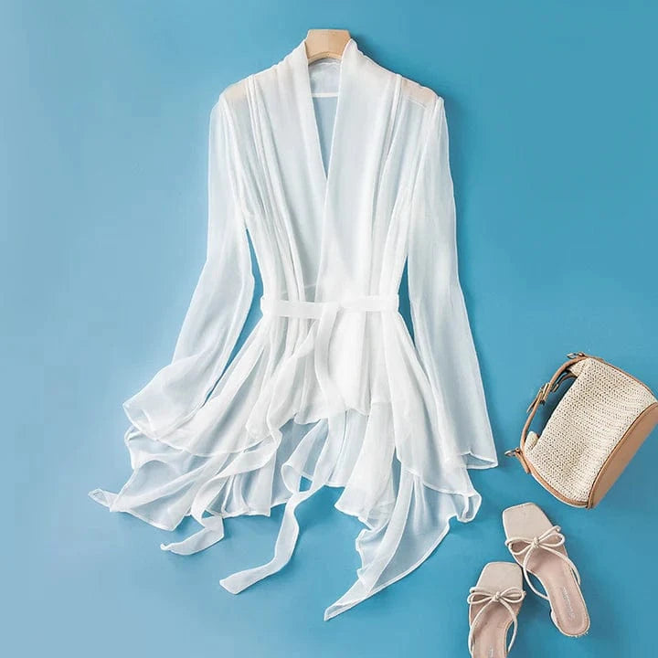 Woven from silk, this wrap floats with a cinched waist and fluid hem. Long sleeves and a delicate tie bring grace in motion—stitched for soft light and quiet shade.