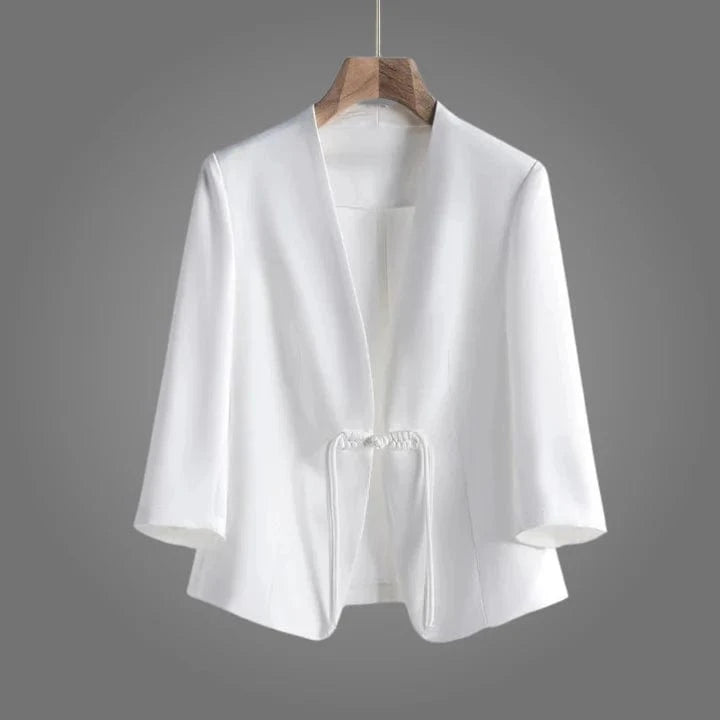 Cut from fluid silk and cinched with a delicate knot, this blazer delivers effortless femininity in motion. A soft power layer for elevated dressing.