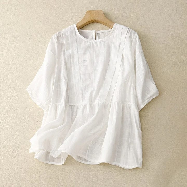 Soft pleats fall like shadows in late afternoon sun. This gossamer linen blouse embraces subtle drama with its sculpted volume and cinched waist, whispering nostalgia for simpler rituals. It’s the kind of piece you find once and never forget.