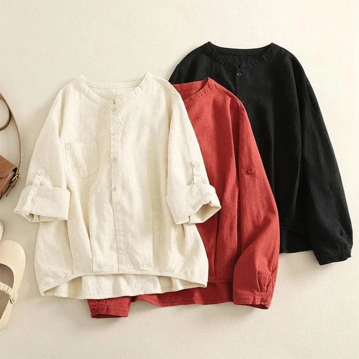 Made from our featherlight Gossamer Linen, this long-sleeved blouse blends ease with intention. A rounded collar, front pocket, and simple placket offer calm structure—shaped for days that ask nothing but presence.