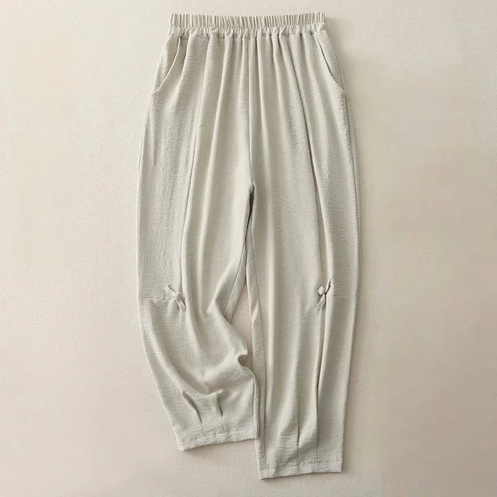 Rendered in our signature Gossamer linen, these pants offer a flowing silhouette finished with subtle knots at the leg. Designed to breathe and move with grace—where comfort meets composure.