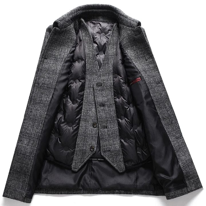 The rich wool exterior brings warmth with a structured fit, while beneath, a padded vest quietly works to trap warmth, ensuring that elegance and practicality move hand in hand.