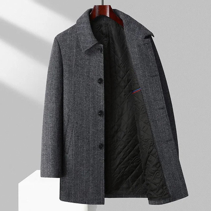 Made with dense wool, our Meek William Trench Coat features a quilted lining for cozy warmth, a classic button-up front, and practical pockets.