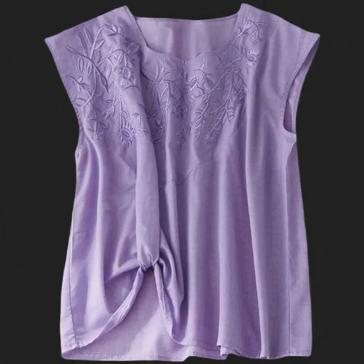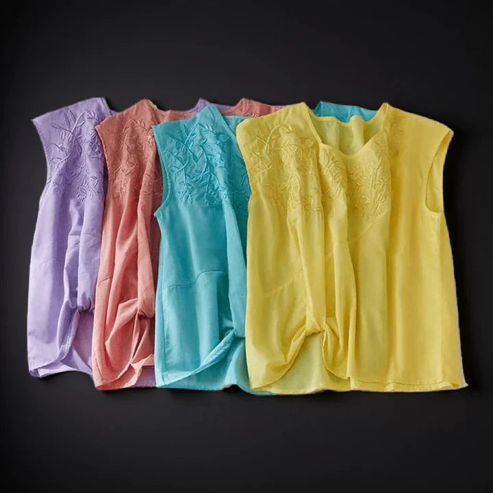 Lightweight and composed, this sleeveless blouse features tonal embroidery that blooms across the yoke like pressed botanicals. A gentle drape moves with grace, while soft seams frame the waist in subtle ease. Crafted to feel like memory—worn without weight.