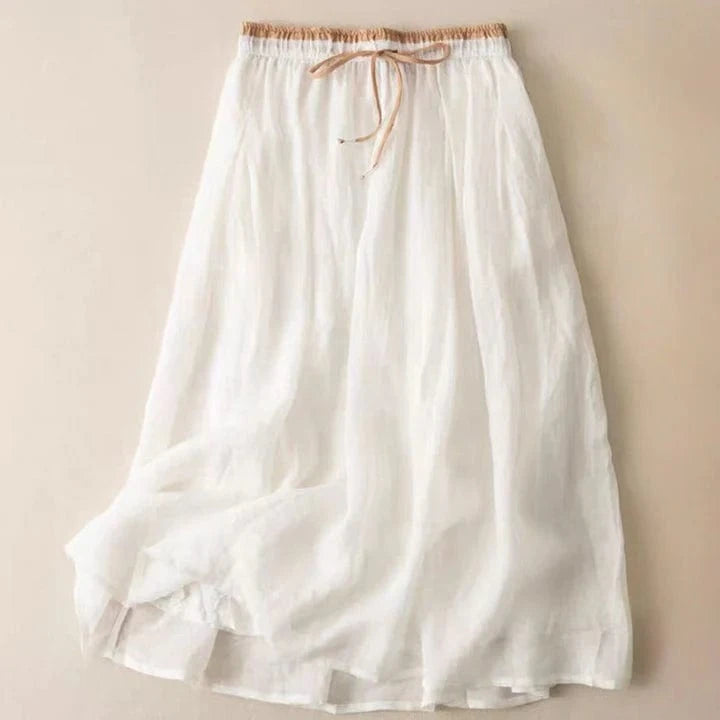 Crafted from pure linen, this skirt falls in gathered tiers that move like quiet wind. With a soft drawstring waist and fluid silhouette, it whispers ease—tailored for moments that drift between barefoot mornings and unhurried evenings.