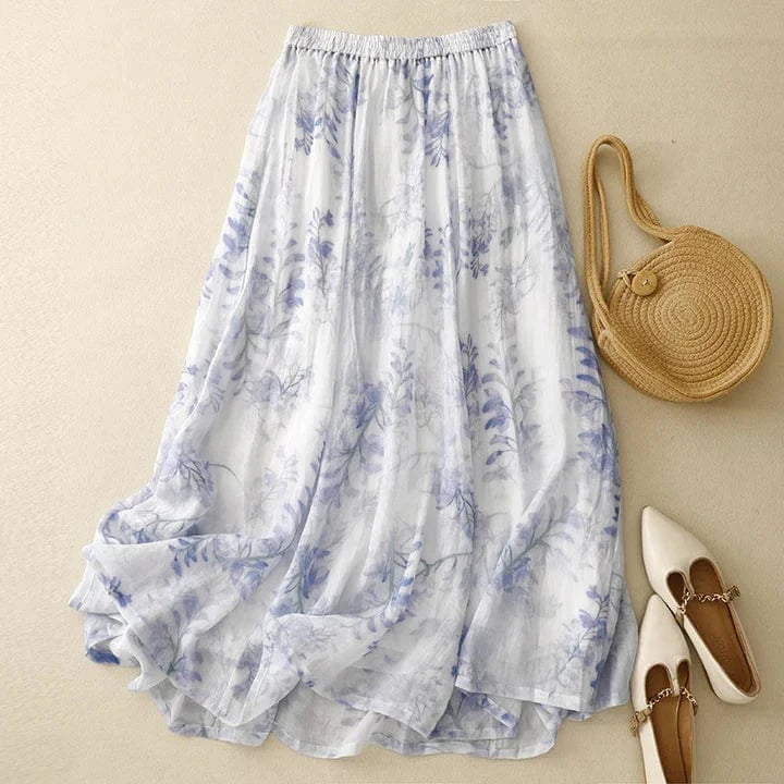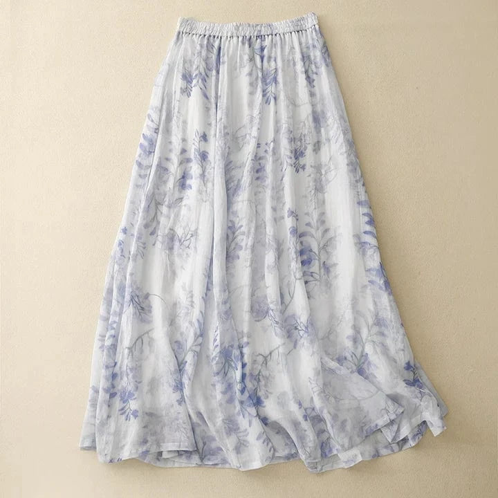 Woven from soft linen, this printed skirt flows with gathered pleats and gentle sway. A drawstring waist rests easy, while tonal patterns rise and fade in quiet rhythm—stitched for mornings steeped in stillness and art.