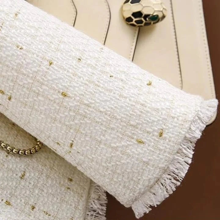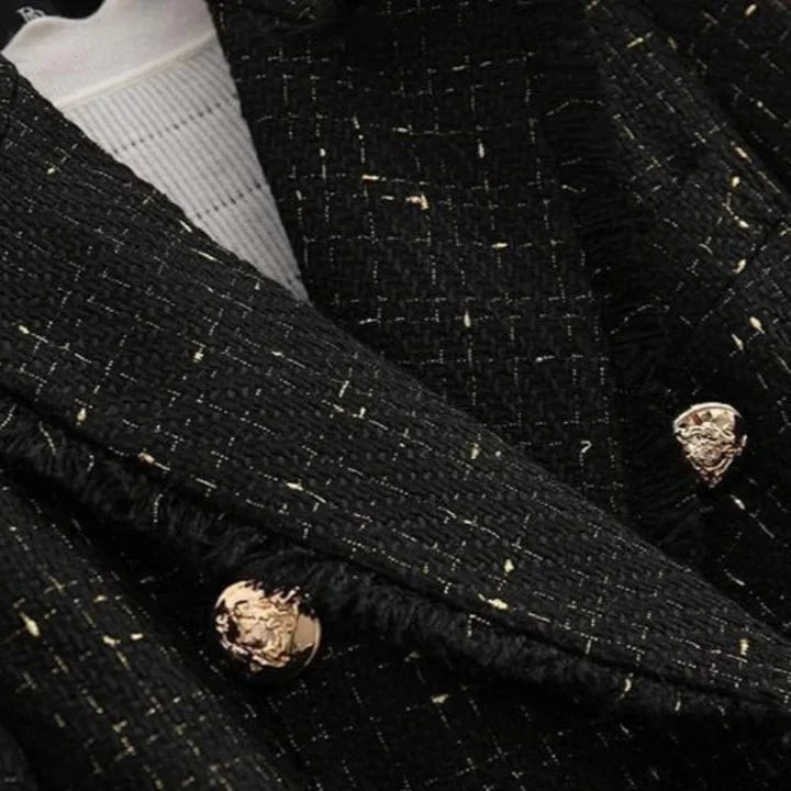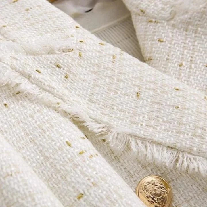 Tailored in structured tweed, this double-breasted blazer features gold-toned buttons and a fringed hemline. The notched collar and long silhouette lend graceful polish—bold yet elegant.