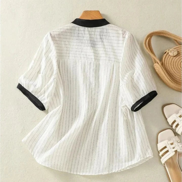 Rendered in featherlight Gossamer Linen, this modern button-up plays with contrast. Clean lines meet relaxed tailoring in a design that reads both composed and comfortably undone.