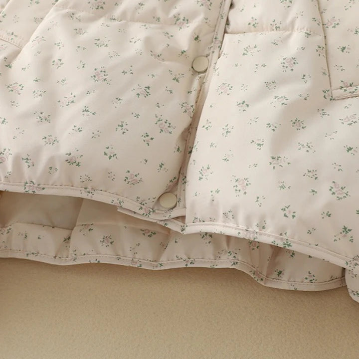Quilted for warmth and scattered with delicate florals, this puffer jacket wraps you in winter charm. The high stand collar shields against cold winds, while the relaxed silhouette and drawstring hem offer cozy ease—perfect for frosted mornings and quiet strolls.