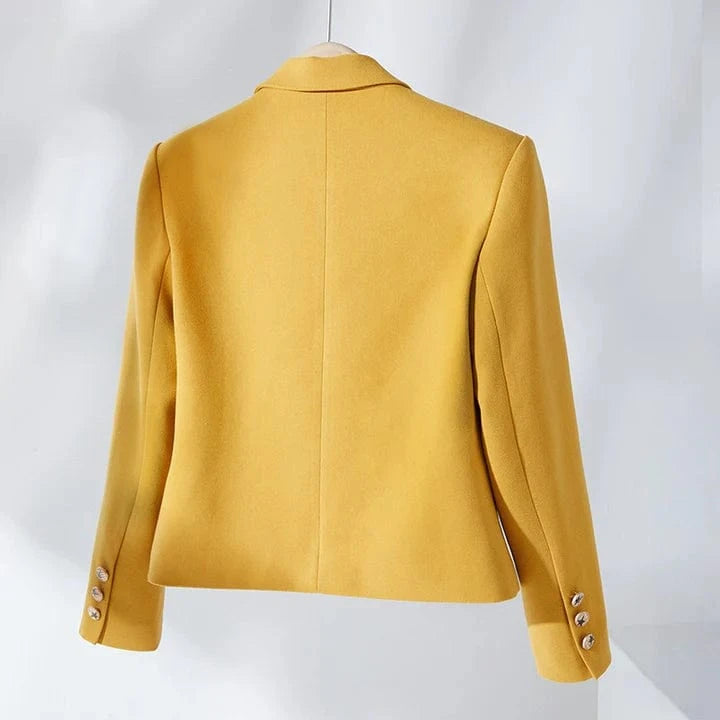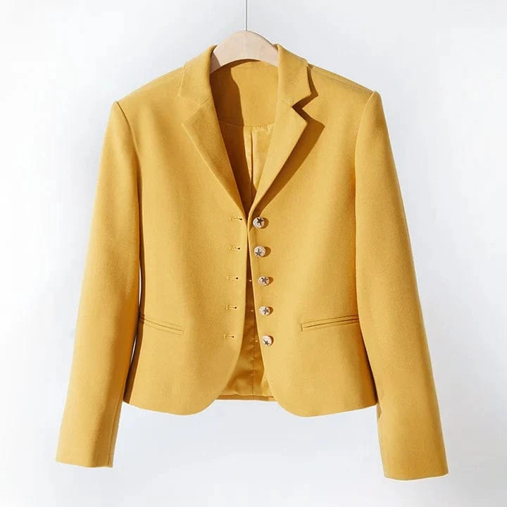 Tailored with precision, this jacket defines clean lines and sharp intent. A row of embossed buttons creates vertical balance, while the structured silhouette frames the form with quiet strength. A wardrobe anchor, made to lead.