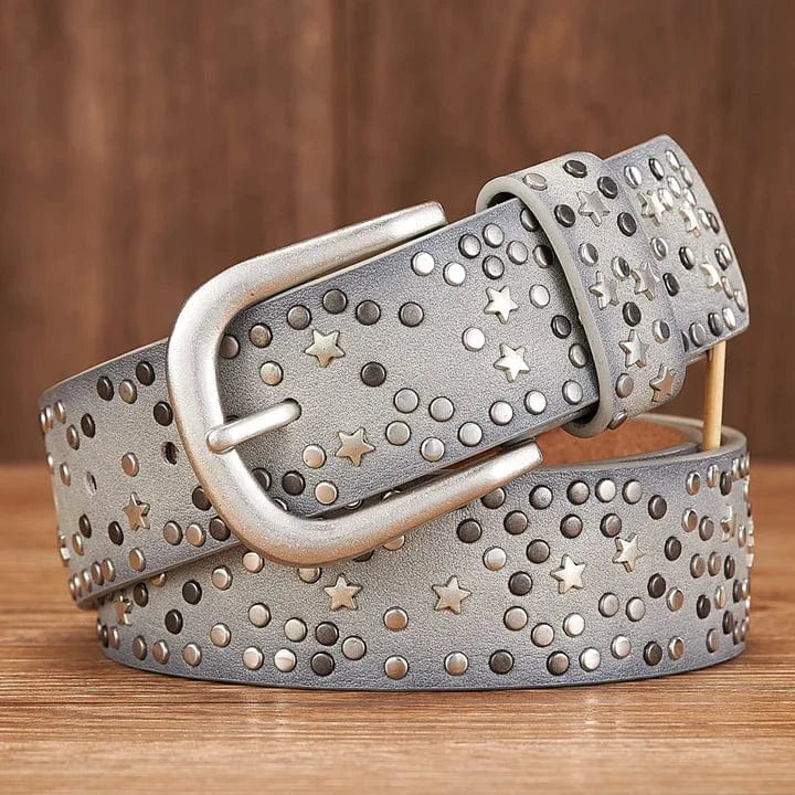 Unleash your inner star with our Miss Montana studded belt, where every metal accent and star detail infuses cosmic energy into your style. Perfect for those who dare to stand out, this leather belt transforms you into a true icon.