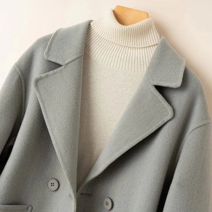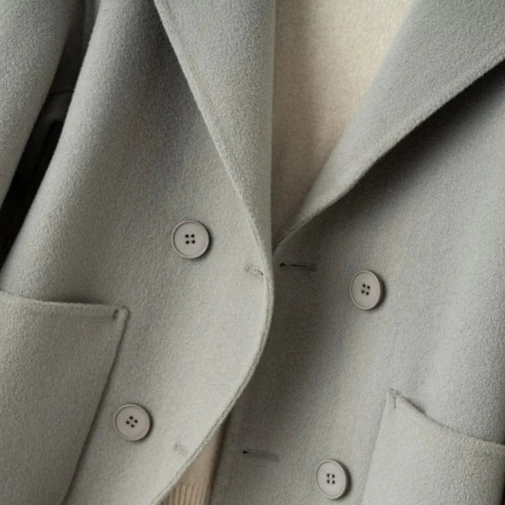Simplicity at its finest. Cut from heavyweight wool in a softened sea-glass hue, this coat wraps the body in warmth while maintaining its architectural poise.