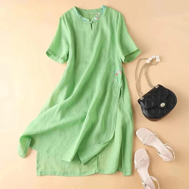 A modern silhouette in our signature Gossamer Linen. this dress flows with soft weight and gentle structure. A stand-up collar and side slits shape its quiet grace, while delicate accents bloom near the seams—stitched for still afternoons and slow tea hours.