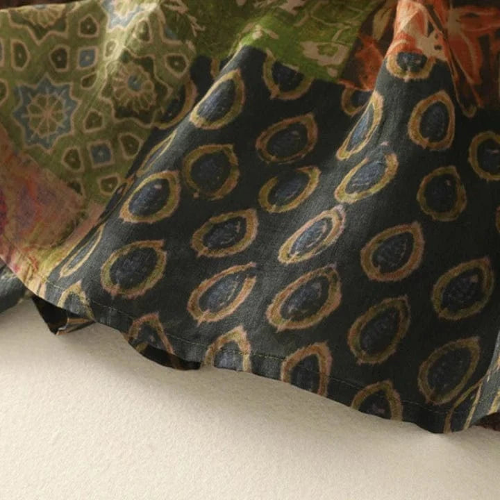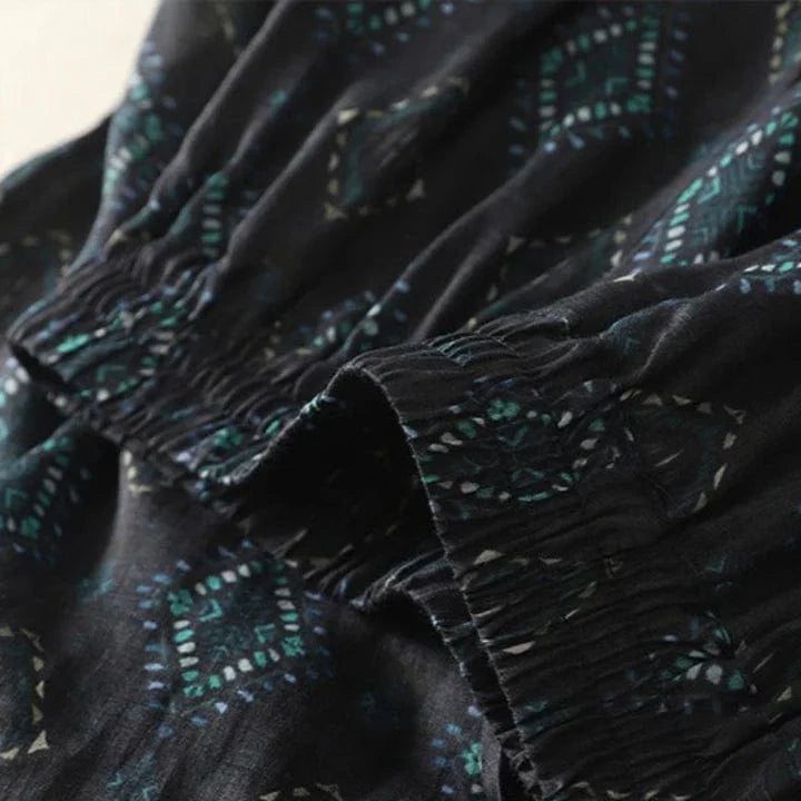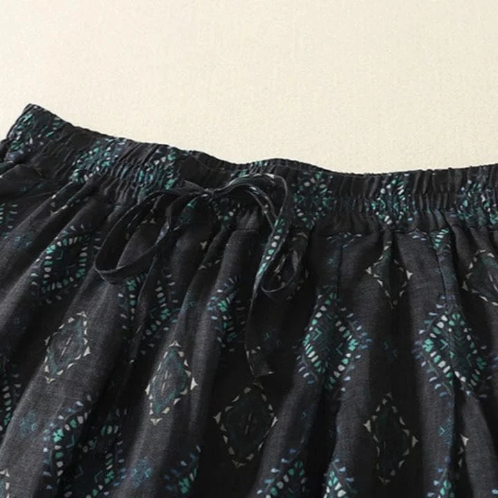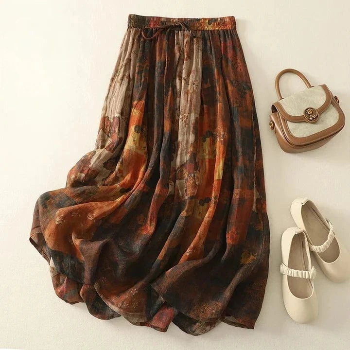 Woven from airy linen, this printed skirt moves with layered softness and quiet ease. An elastic waistband rests gently at the waist, while its flowing hem drapes in calm rhythm—stitched for moments that glide between light and shade.