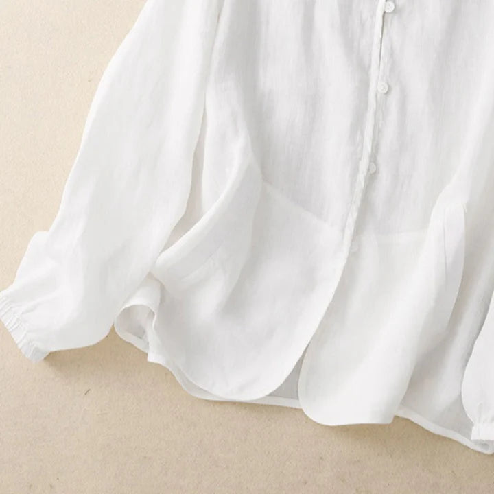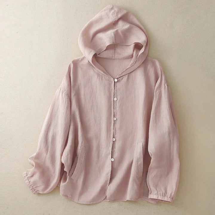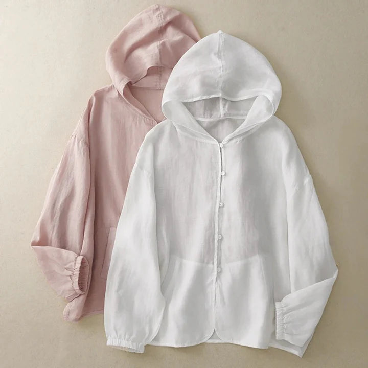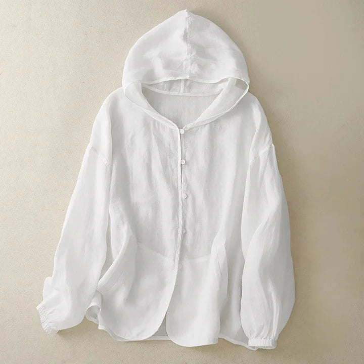 Linen, shaped to flatter. this lightweight hoodie floats with airy softness and a gathered sleeve. A gentle hood and clean buttons offer shade and ease—stitched for sun-filled walks and quiet shade.