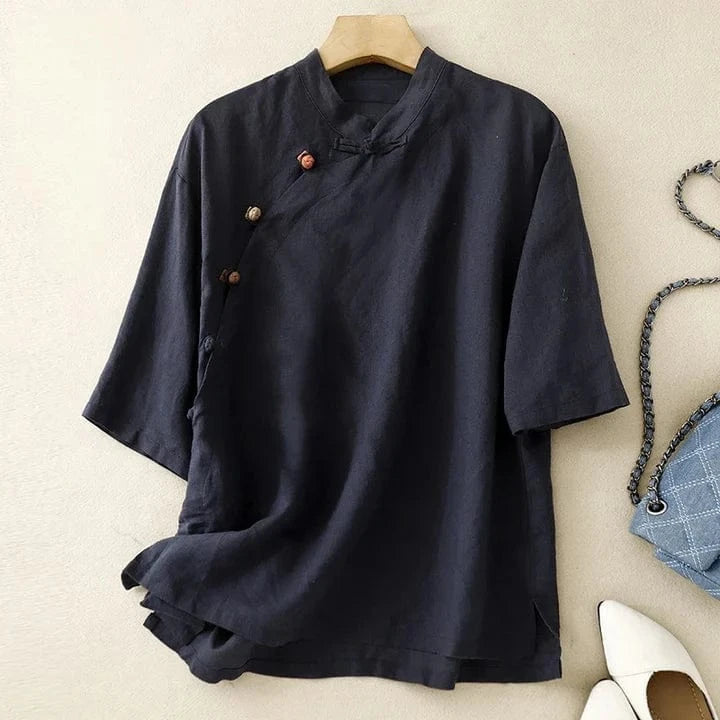 Crafted from pure linen, this blouse folds softly with its side-tied buttons and curved hem. A mandarin collar adds a hint of quiet poise—woven for slow mornings and whispered tea rituals.