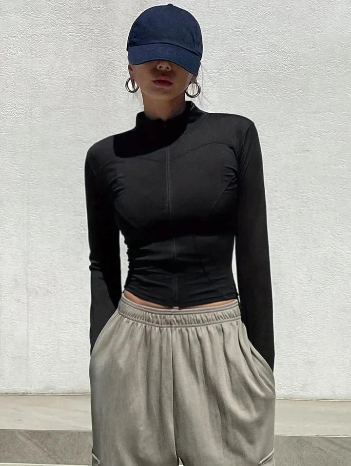 a wardrobe staple that speaks volumes. Designed for the empowered woman navigating spring and fall, its sleek zipper front and slim fit,  make a lasting impression with this addition, crafted for those who value both comfort and boldness.