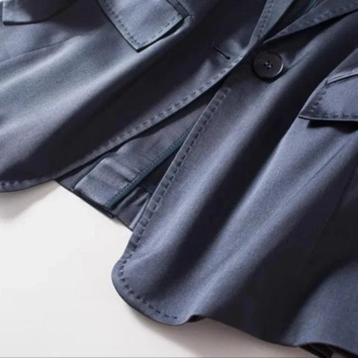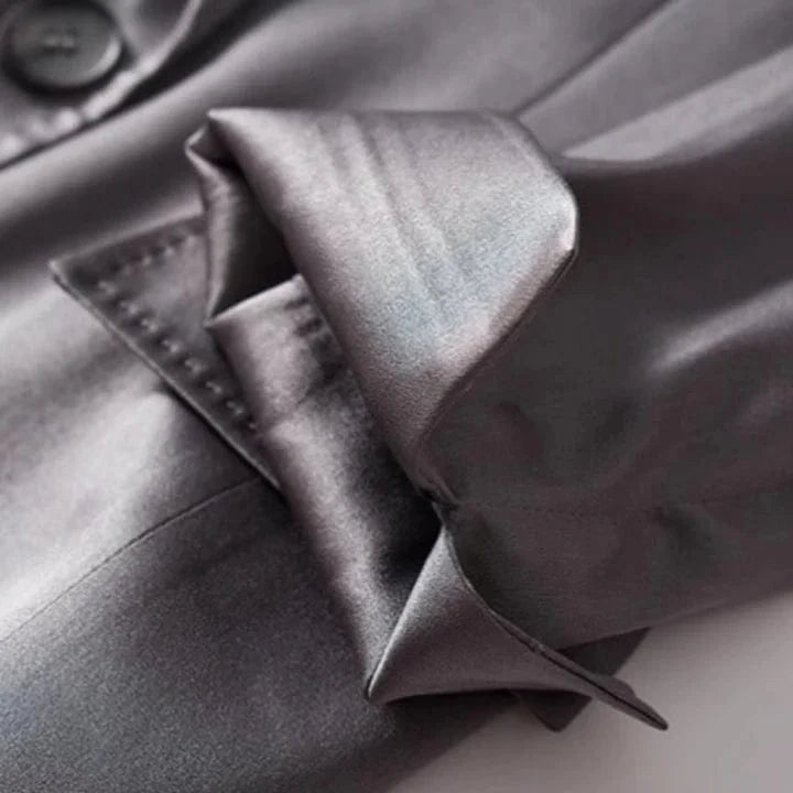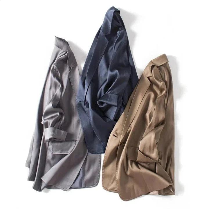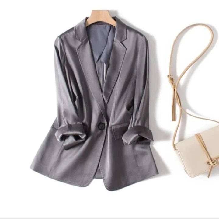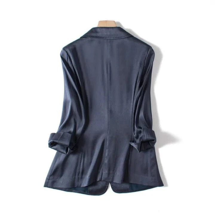 Cut from fluid silk with a matte finish, this blazer glides with quiet grace. A single-button closure and soft tailoring bring understated polish—designed to follow the body's rhythm from early light to evening hush.
