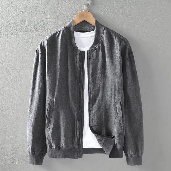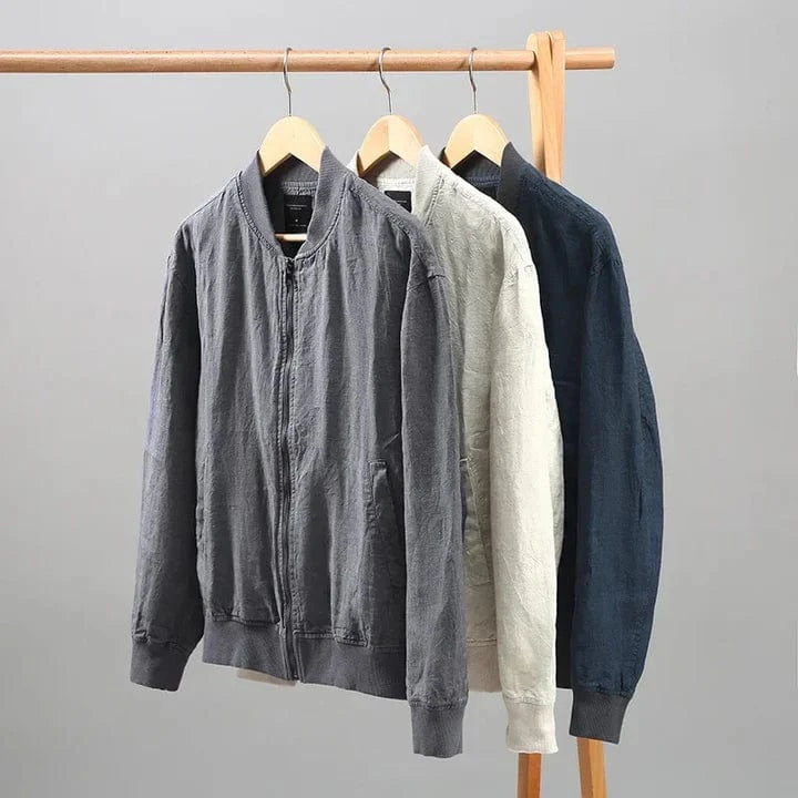 Crafted from a premium linen-cotton blend, this bomber jacket is built for effortless layering. Its natural texture offers breathability, while ribbed cuffs and a clean silhouette add a refined edge to any look.