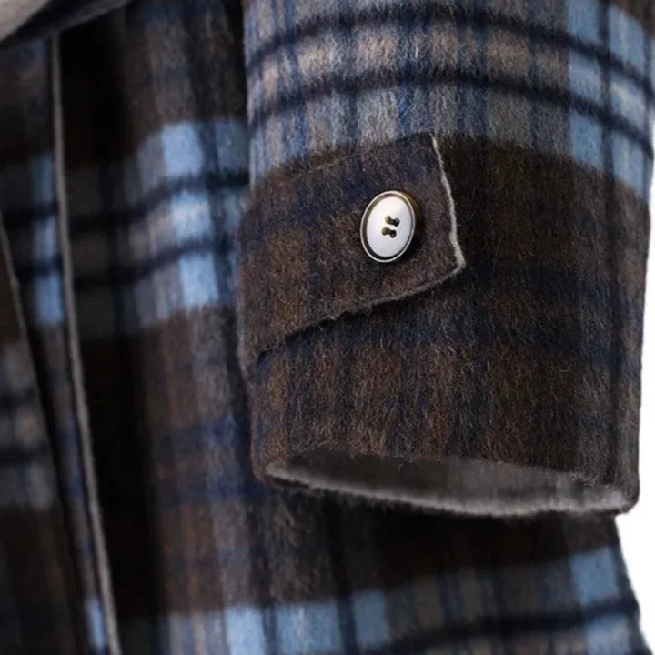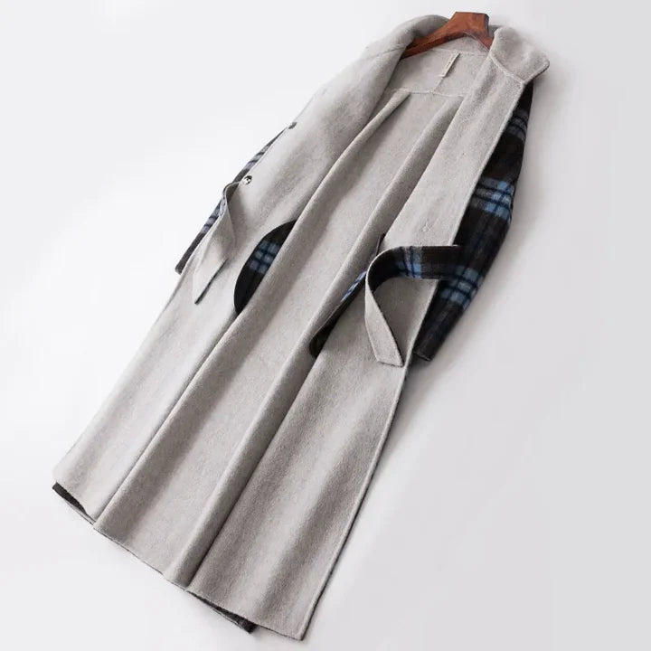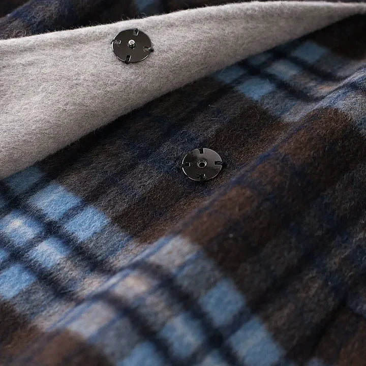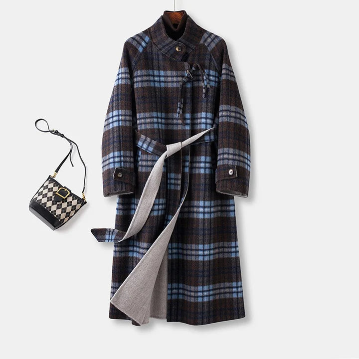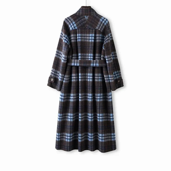 Crafted from brushed cashmere in rich navy and brown tones, this coat reinterprets the traditional plaid with a modern drape. A detachable inner panel adds subtle contrast, while the belted waist cinches the look with confidence and poise.