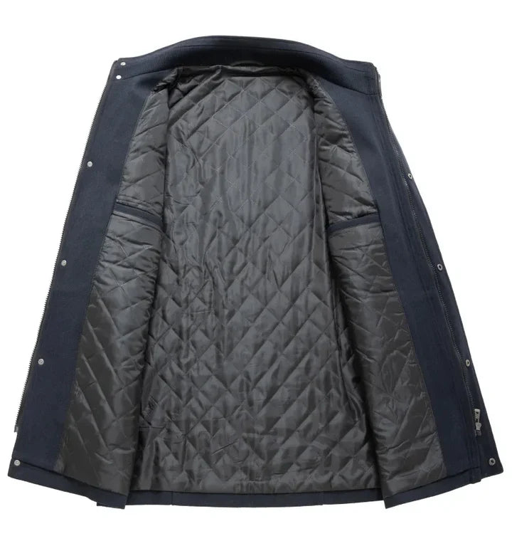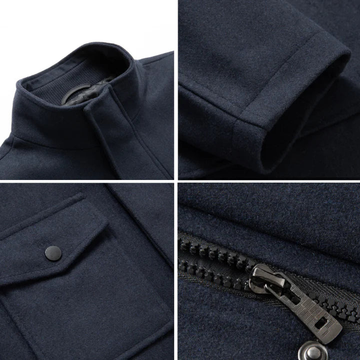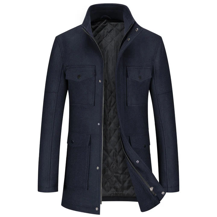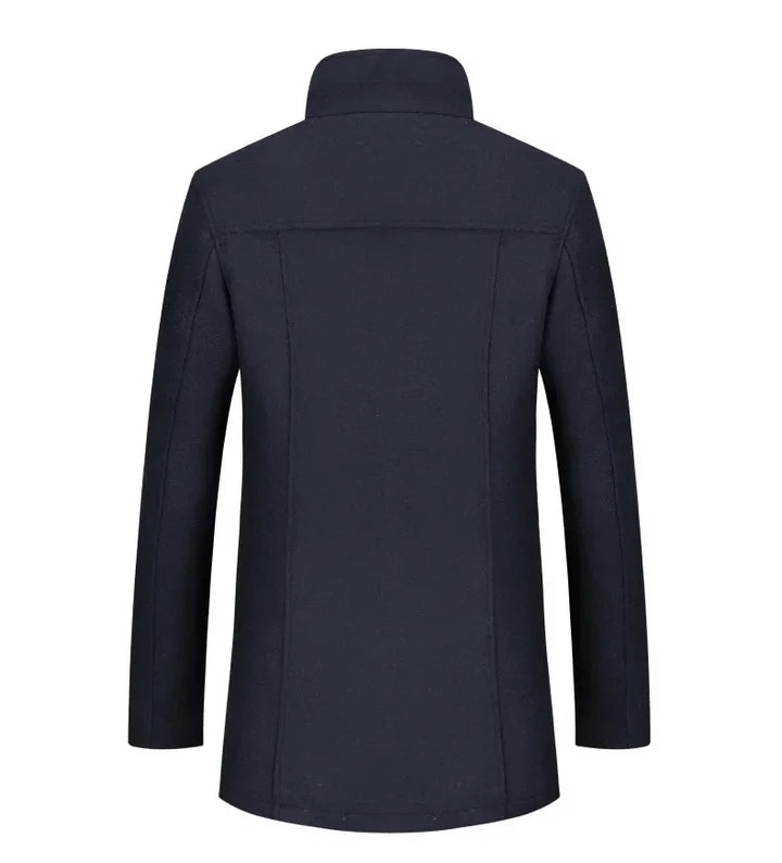 This overcoat, crafted from a robust wool blend and accented with precision stitching, exudes an air of quiet confidence while embracing the chill of winter with effortless poise.
