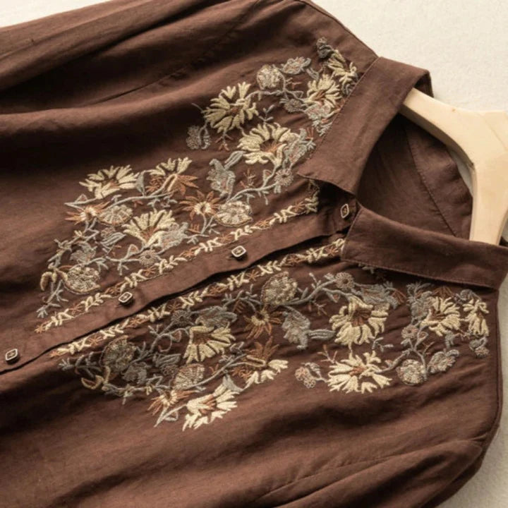 Woven from breathable linen, this shirt features intricate floral embroidery blooming across the chest. A pointed collar and buttoned front ground the design, while its relaxed drape lends a gentle charm—made to carry stories in every thread.