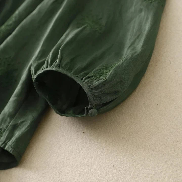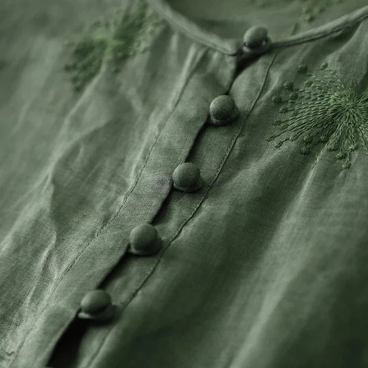 This blouse is a whisper in form—defined by a stand collar, covered front buttons, and delicate embroidery that blooms beneath the surface. Its ease of movement meets composed lines, a silhouette built for pause and presence.