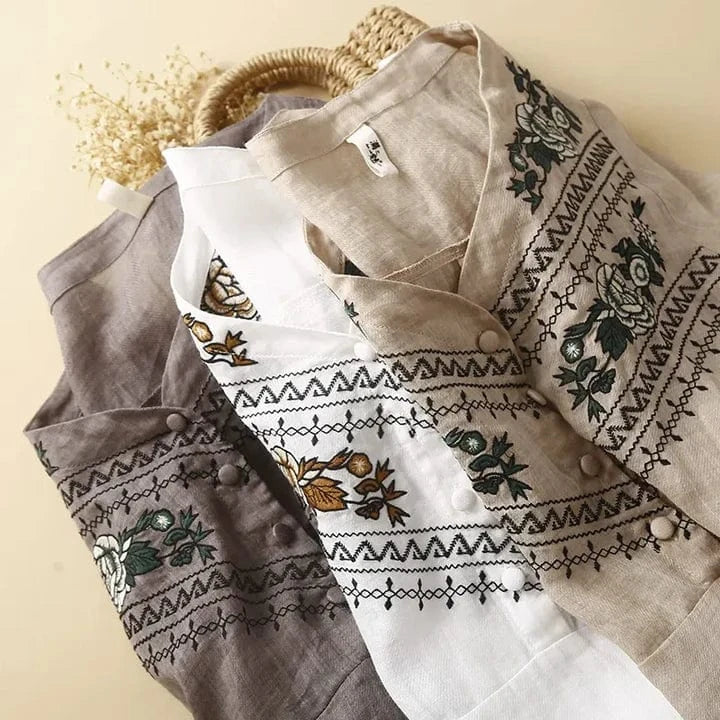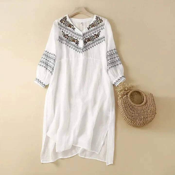 Crafted for sun-drenched days and liberated movement, its breathable expanse flows with an inherent rhythm, effortlessly cinching into your unique style. The bold, dark accents at the neckline and placket anchor its free-spirited soul, creating a statement of authentic comfort and bohemian luxury.