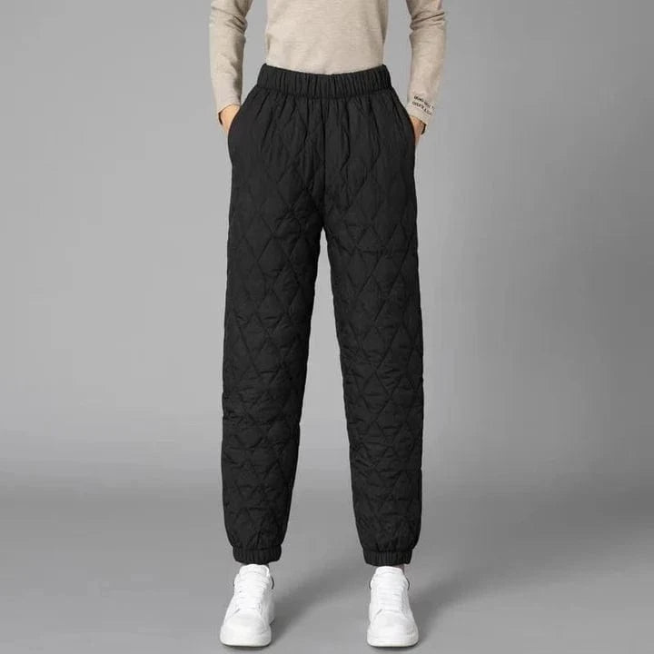 Crafted from soft, insulated material, these quilted pants feature an elegant diamond stitch that adds texture and charm. The elasticized waist and tapered cuffs provide a secure yet relaxed fit, making them an ideal choice for both casual outings and cozy days at home.