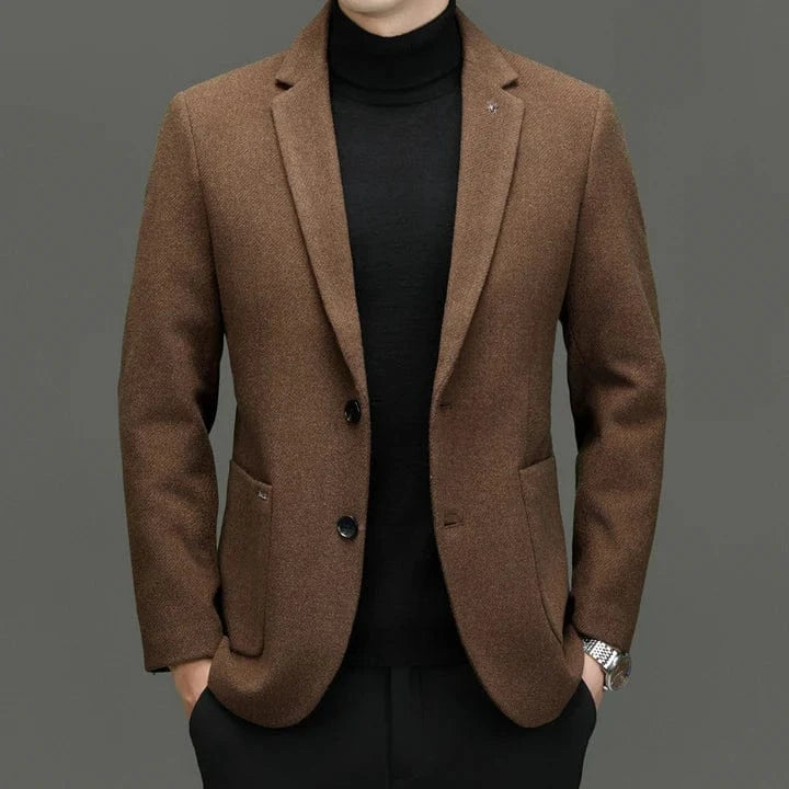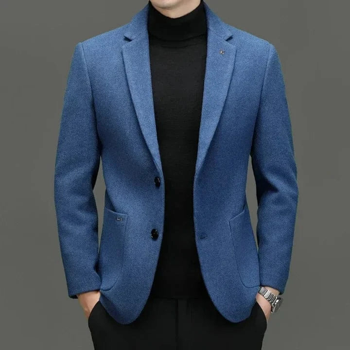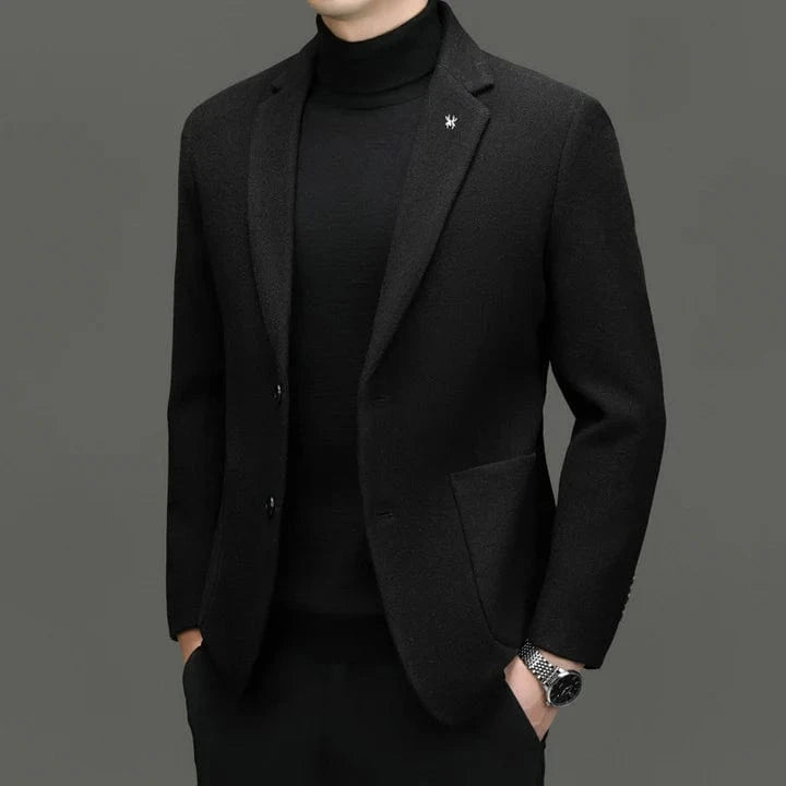 Enveloped in the richness of heavyweight wool, this blazer forms a barrier of warmth and structure, its tailored silhouette redefining the intersection of cold-weather armor and timeless sartorial excellence.