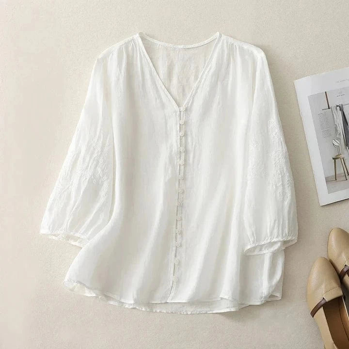 Crafted from pure linen, this airy blouse flows with a quiet rhythm. Delicate embroidery graces the sleeves, while a line of soft buttons draws the eye from collar to hem.