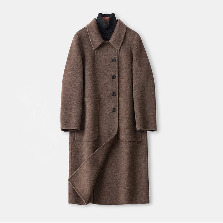 Spun from the finest cashmere, this coat captures warmth in its purest form. The elongated profile frames the figure with understated elegance, while deep front pockets offer both form and function. Every seam is an expression of restraint—crafted for those who appreciate subtle grandeur.