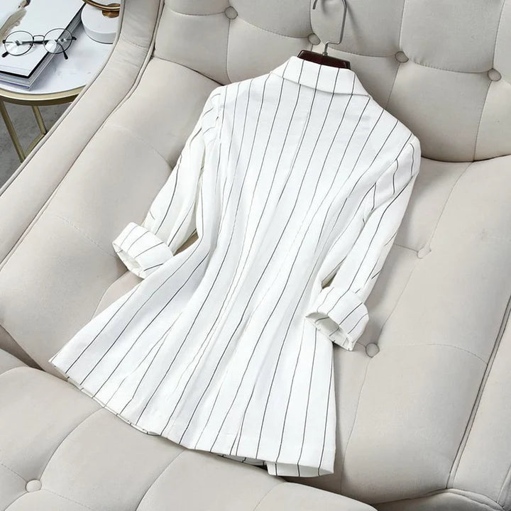 Modern tailoring at its most intentional. Crafted from premium linen, the blazer’s defined cut and vertical lines streamline the profile, offering effortless strength for boardrooms or after-dark occasions.