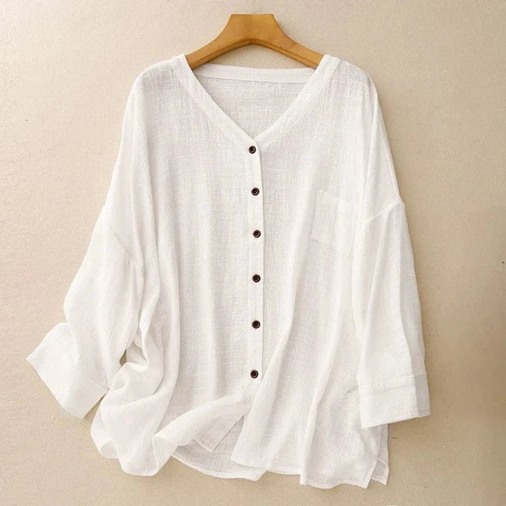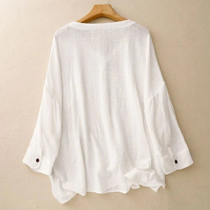 Crafted in our signature gossamer linen, this shirt blends gentle drape with utilitarian detail. Its open neckline and dropped shoulders nod to undone elegance—meant for mornings that unfold without urgency.
