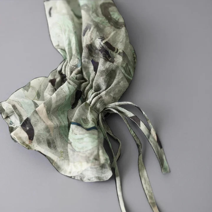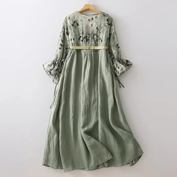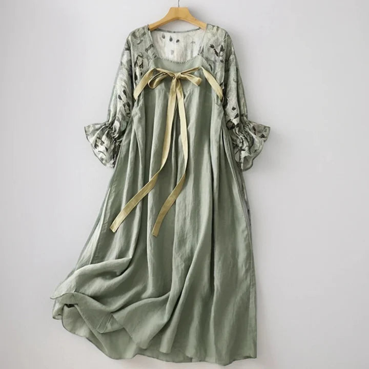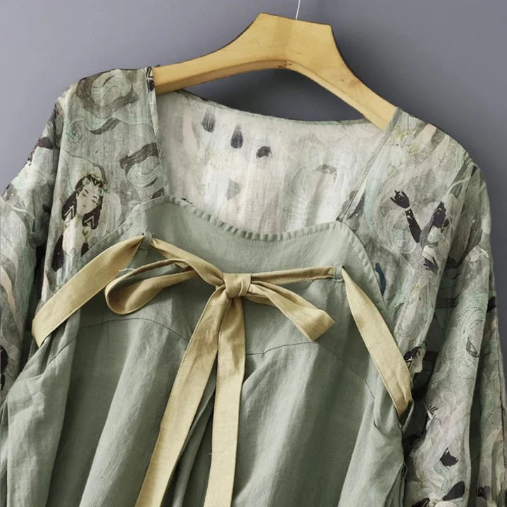 Crafted from whisper-light linen, this dress moves with graceful fluidity. Voluminous sleeves bloom with subtle pattern, while a soft bow cinches the neckline with heirloom elegance. A silhouette designed to wander, breathe, and feel—rooted in texture and soul.