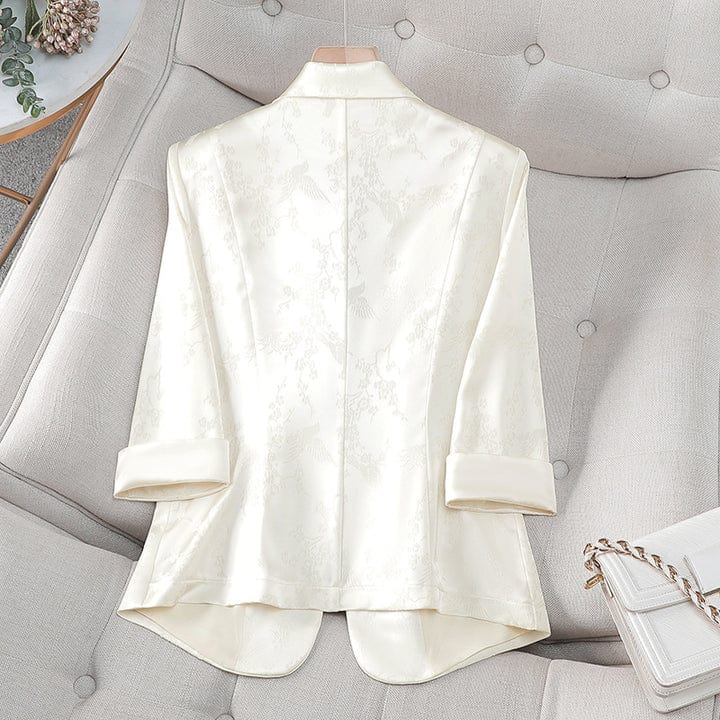 Crafted from silk and delicate in detail, this mid-sleeve jacket weaves subtle patterns into a graceful silhouette. A soft drawstring cinches the waist, lending quiet balance to its tailored charm.