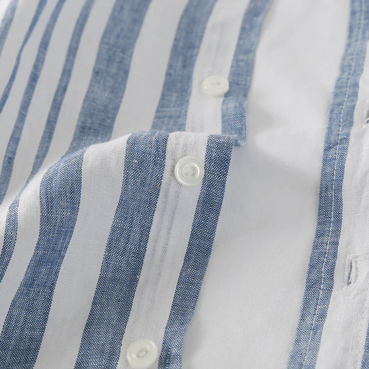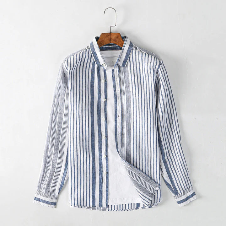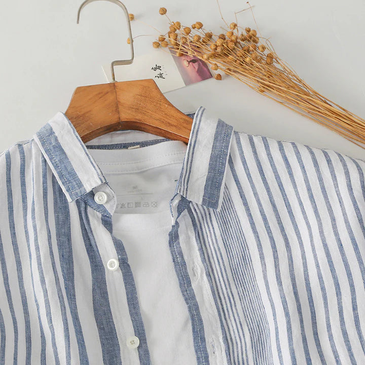 This pure linen shirt cuts in airy stripes that echo wind and water. Tailored with ease, it brings clarity to whatever the day carries.