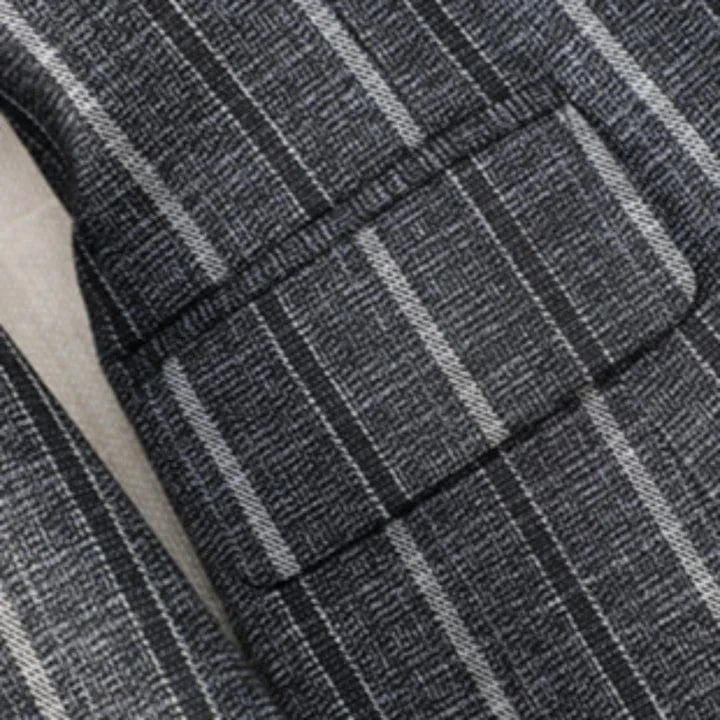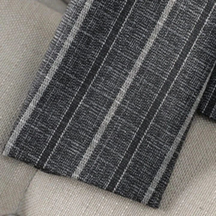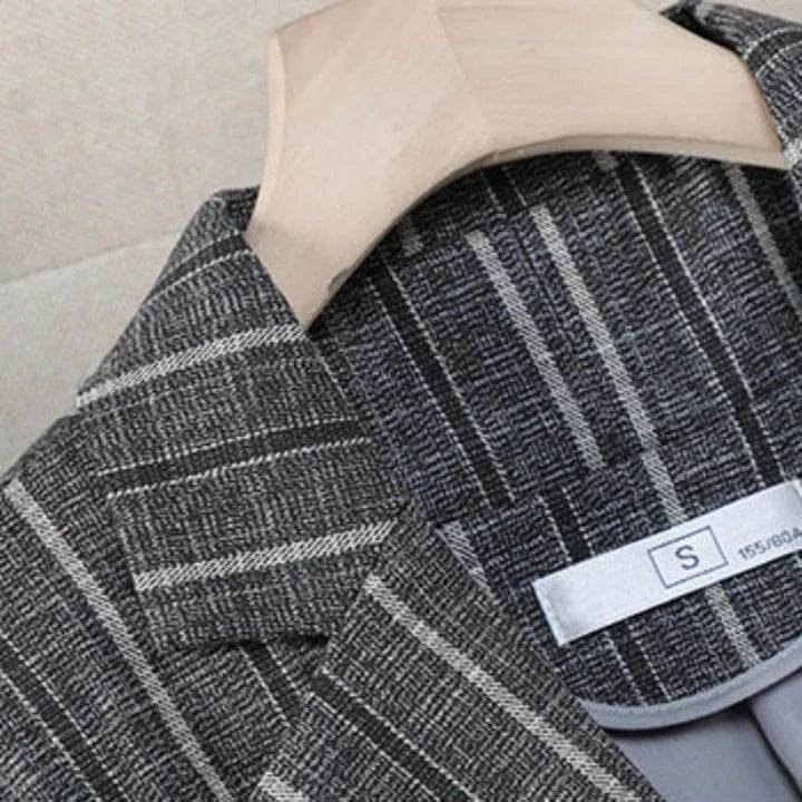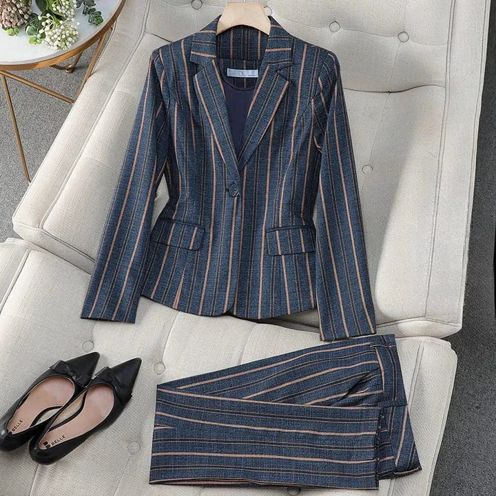 Tailored with precision, this structured set captures vintage elegance with its bold vertical lines. The jacket contours the frame with a single-button closure, while the matching trousers offer a crisp, streamlined silhouette—perfect for elevated daywear or styled office ensembles.