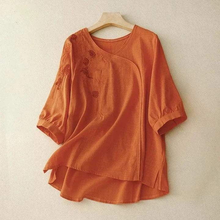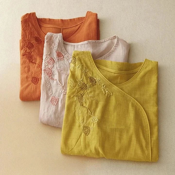 Woven from airy gossamer linen, this blouse cascades in soft layers, graced with delicate floral embroidery. The wrap-inspired silhouette whispers of effortless grace, inviting movement and quiet charm.