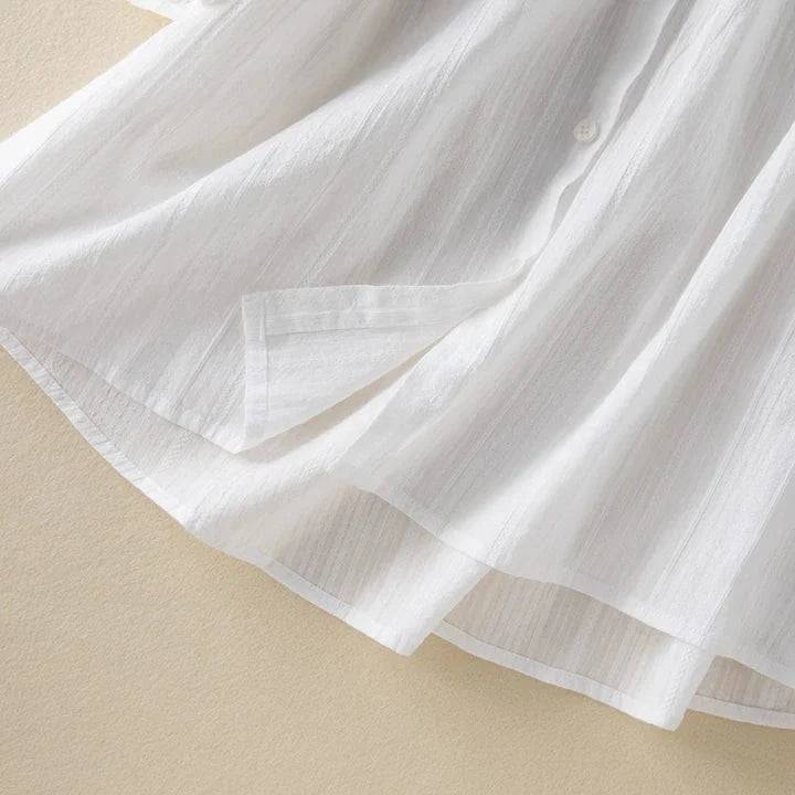 Woven from ultra-soft linen, this blouse flows with delicate jacquard texture and gentle lace trim. A V-shaped neckline and lantern sleeves evoke vintage charm—light as breeze, calm as morning.