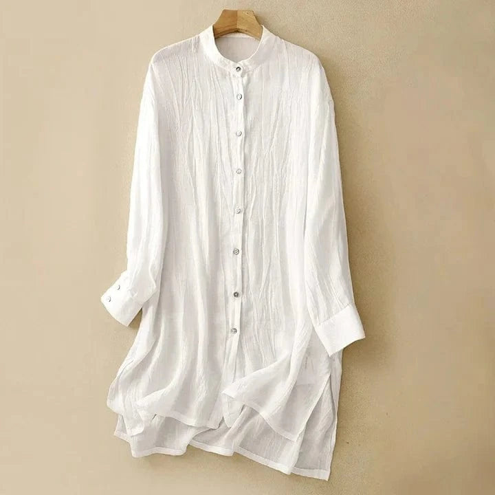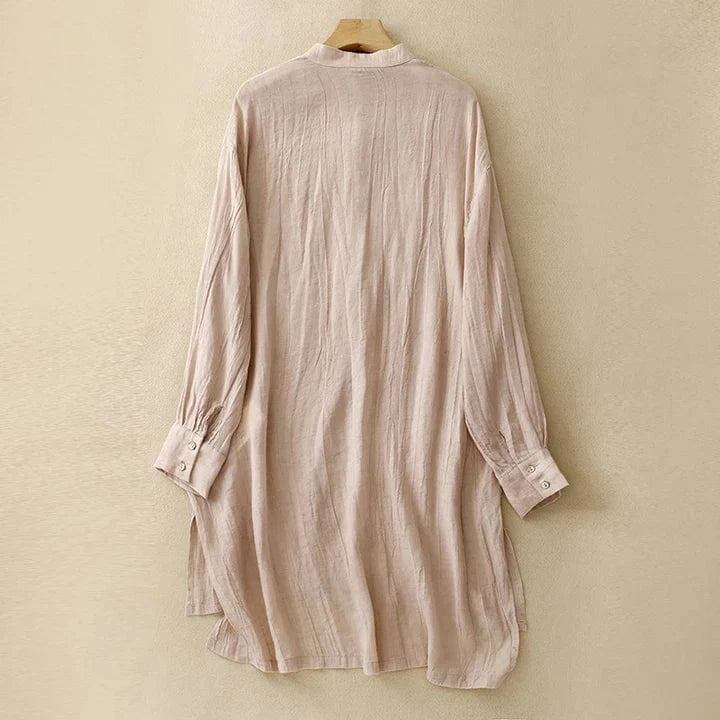 Woven from our featherlight Gossamer linen, this mid-length dress flows with quiet ease. A mandarin collar and soft pleats frame the silhouette, while delicate buttons add a gentle rhythm—an ode to calm days and subtle grace.