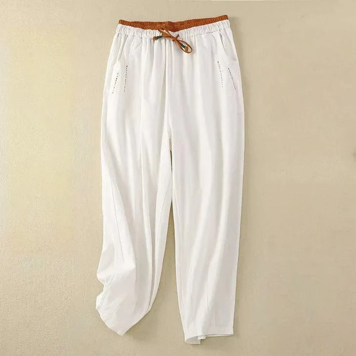 Linen, unfiltered. This relaxed silhouette captures the soul of summer—light, breathable, and a little undone. The cinnamon-hued waistband is a quiet nod to handmade beauty.